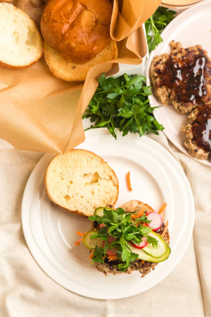 - Toast the buns (optional) and lay out them out. Put the spicy mayo at the bottom, top with a patty, then add the pickled vegetables and cilantro. Add the top of the bun and enjoy.