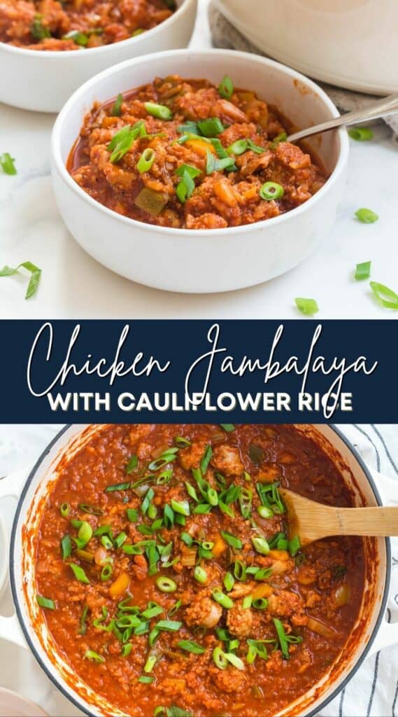 This healthy chicken jambalaya made with cauliflower rice is loaded with vegetables throughout the dish. I love adding cauliflower rice because it’s a hidden veggie, you really don’t see it or taste it but you still get all the health benefits.