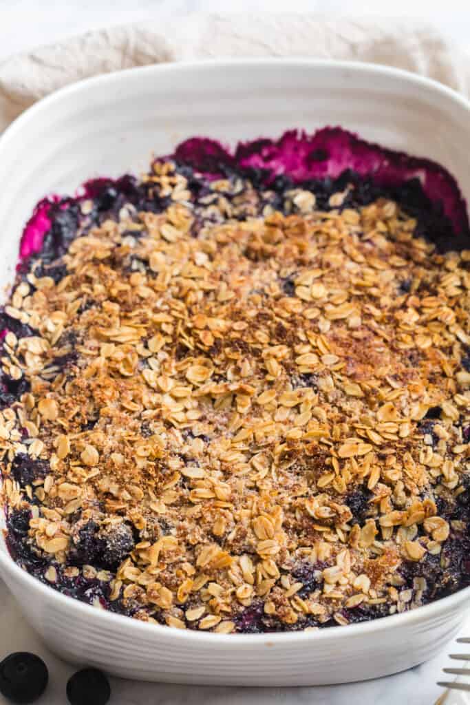 The difference between a blueberry crumble vs a blueberry crisp is that crisps have oats and sometimes may have nuts. Crumbles don’t.