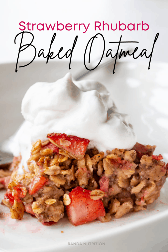 strawberry rhubarb baked oatmeal topped with coconut whipped cream