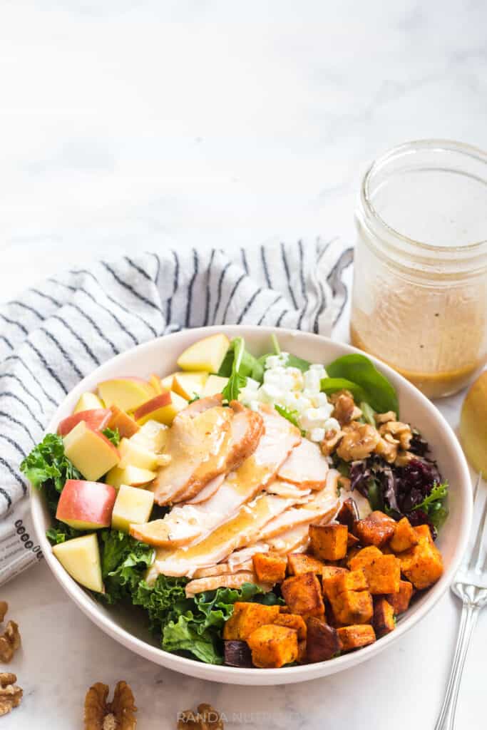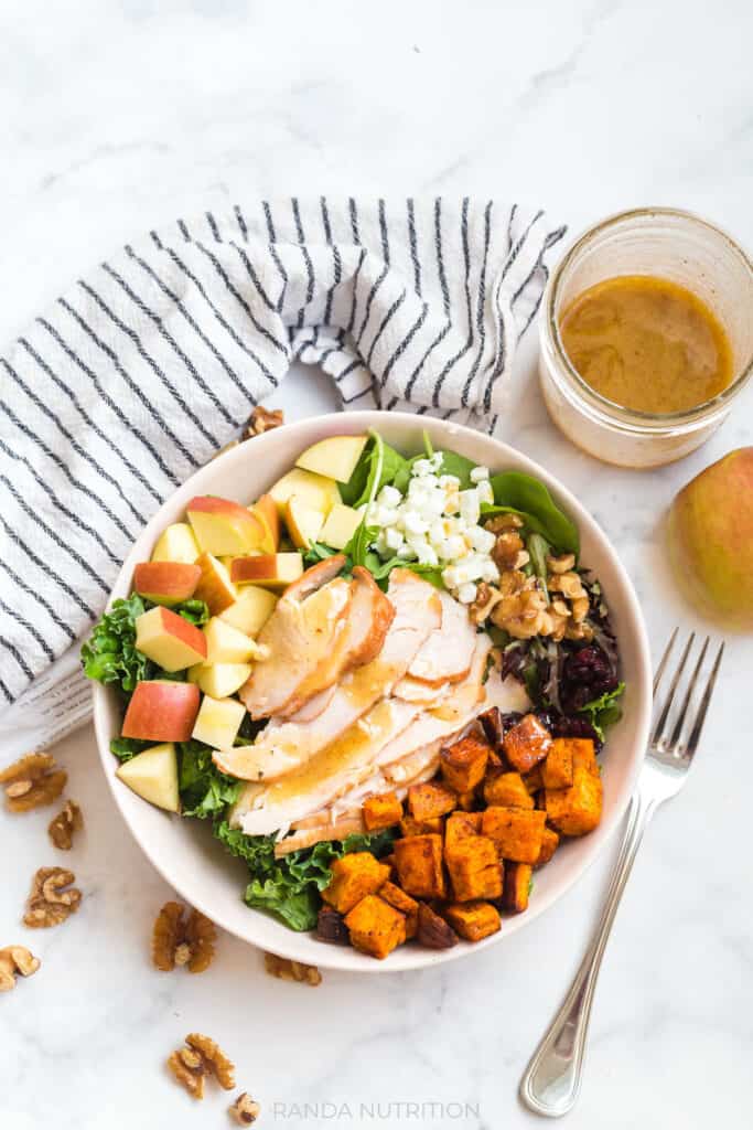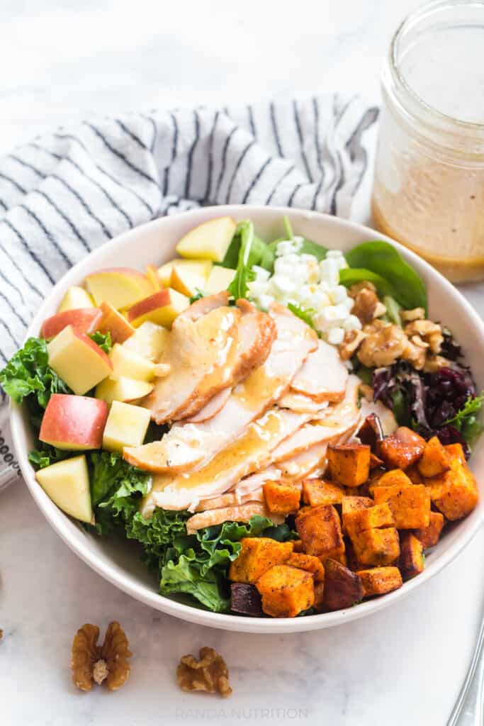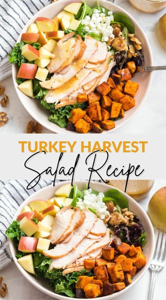 You’re going to love this turkey harvest salad recipe. Not only is it easy to throw together for a quick and healthy lunch, but you also get to eat a lot of food that will keep you full for hours.